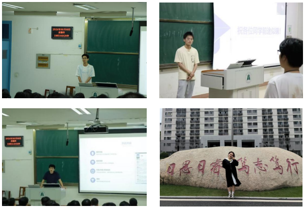 大会开始,四位2020级优秀毕业学长学姐分享了自己在考研、就业方面的经验。刘诗扬学长分享了学习资源和渠道,并强调要明确自己的薄弱环节,及时查漏补缺,提高学习效率;胡帅学长分享了自己的学习经验,并强调了院校选择及学习方法的重要性。